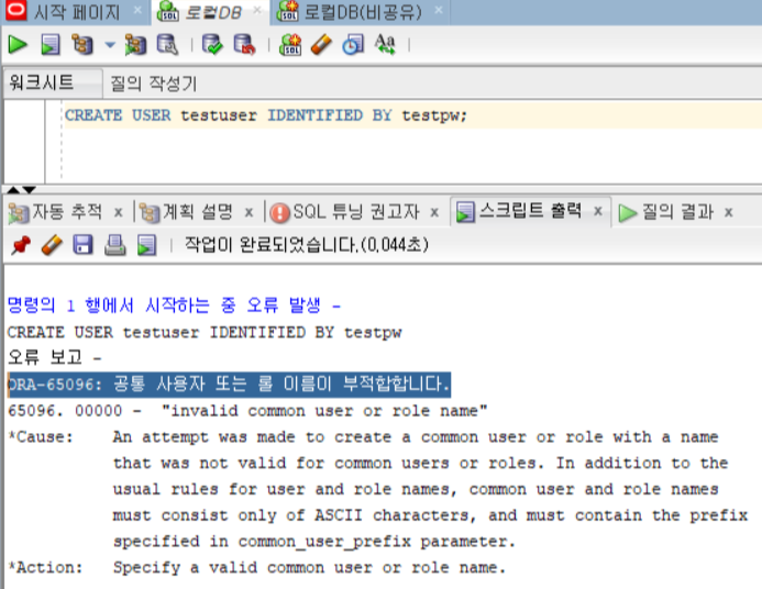 오라클 오류 명 : ORA-65096: 공통 사용자 또는 롤 이름이 부적합합니다.