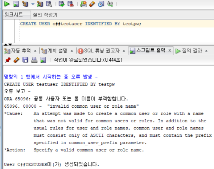세션 환경설정이 변경되었다면 해당 세션에서는 사용자명 앞에 c##을 붙이지 않고도, 오라클 사용자가 정상적으로 생성됩니다.